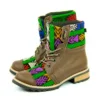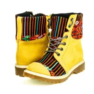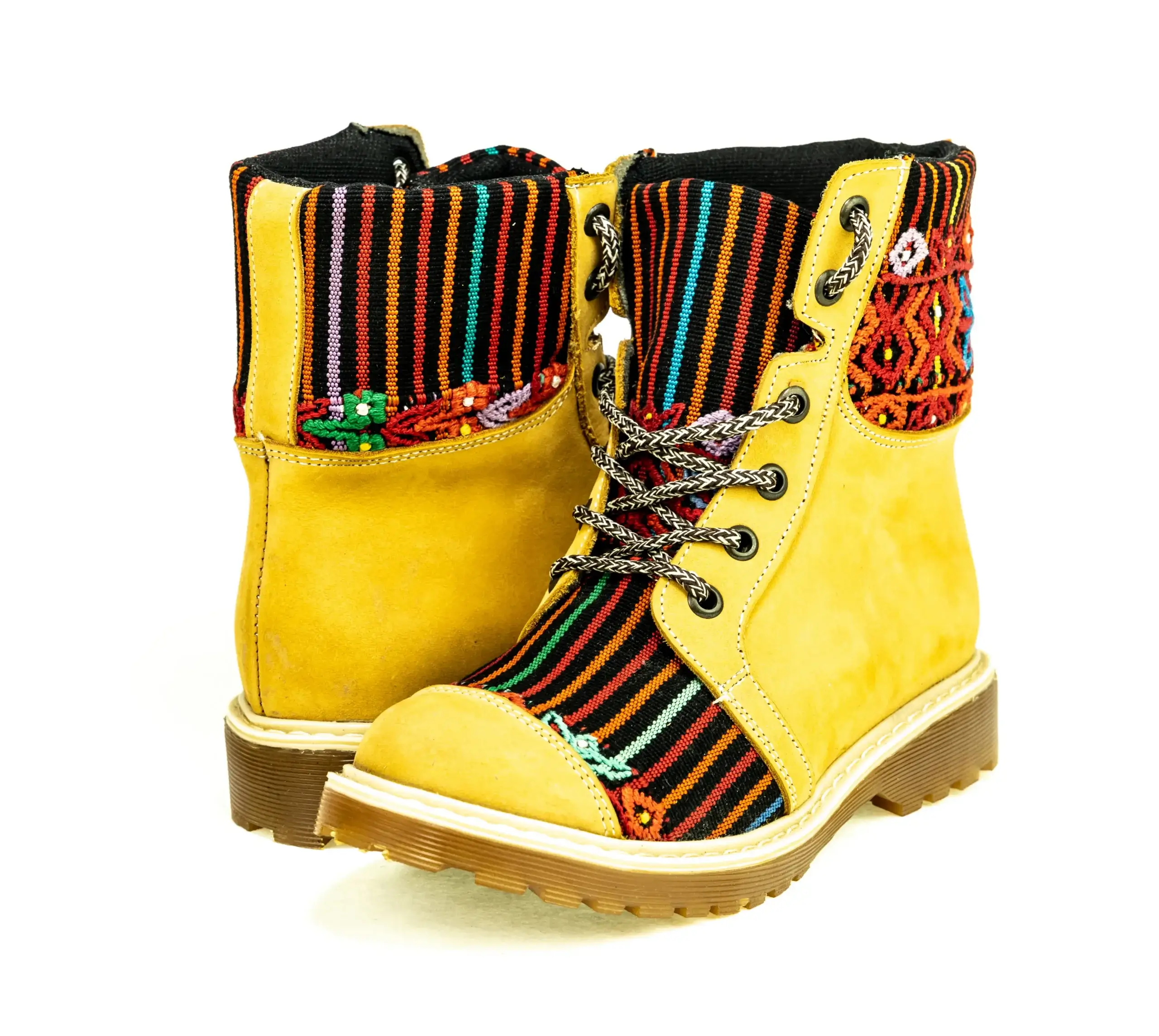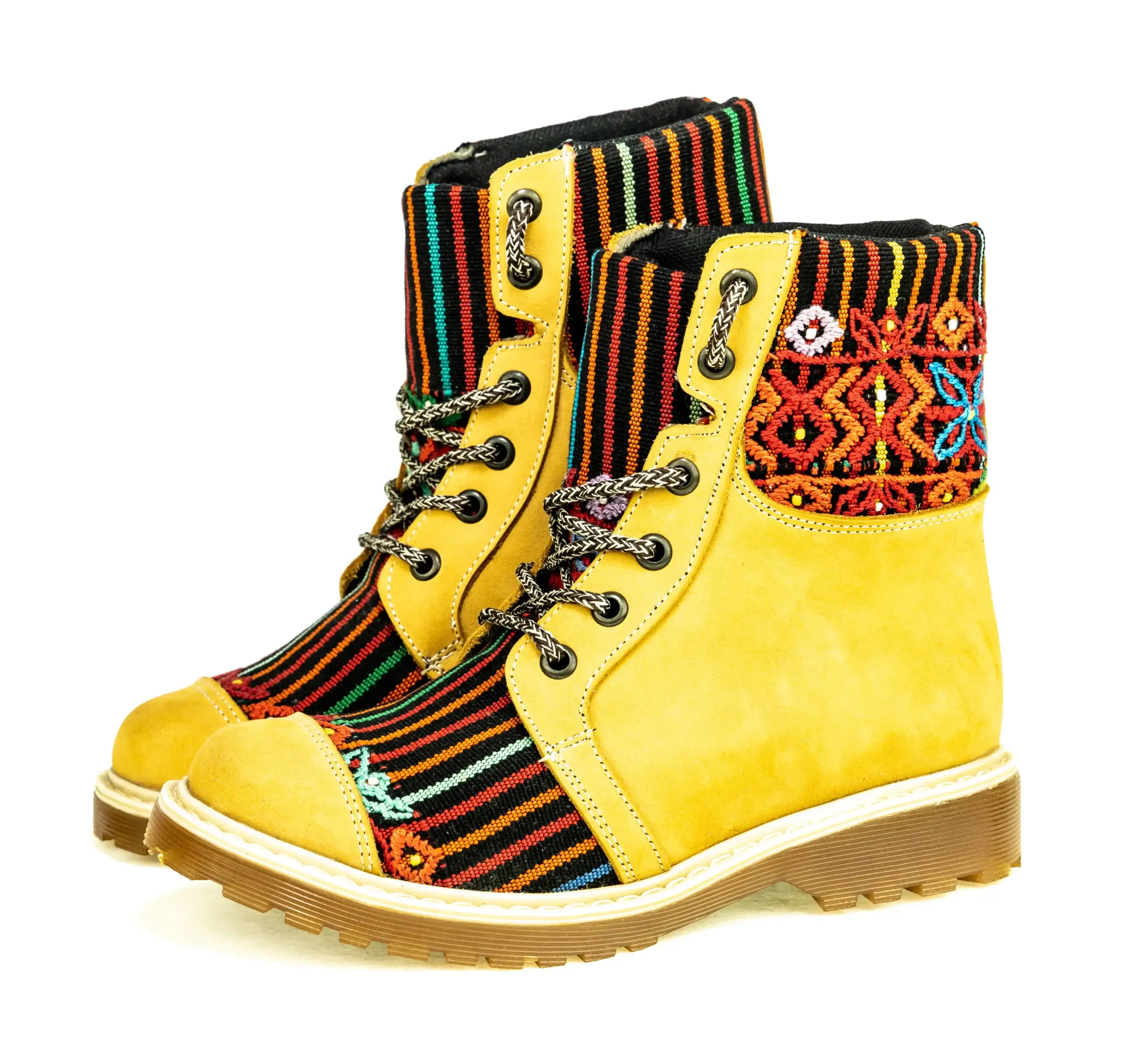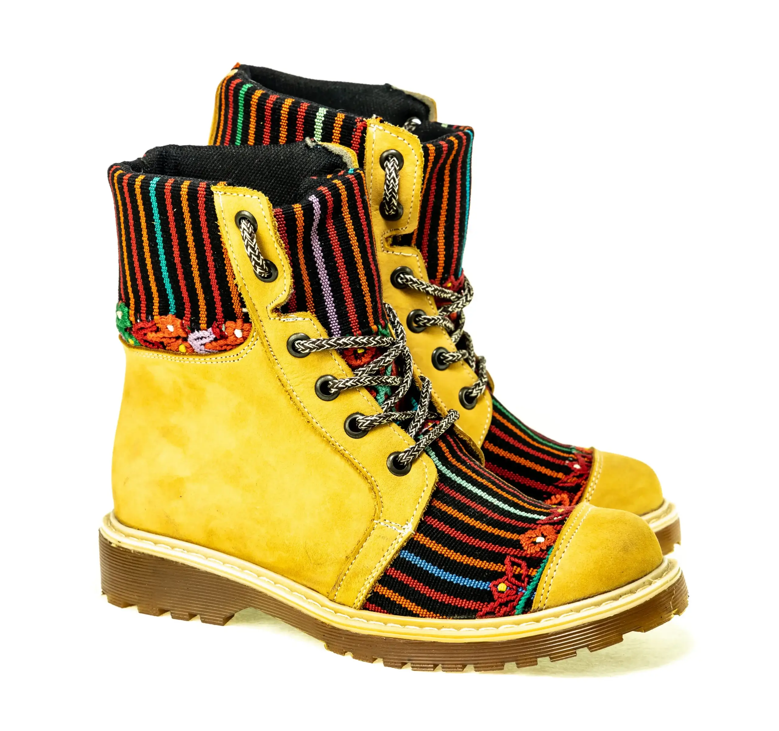Pieza única e irrepetible. Bota minera de piel fusionada con auténtico textil maya tejido a mano en telar de cintura. Un diseño contemporáneo pensado para quienes valoran la moda consciente y buscan un estilo inigualable. Al ser una obra artesanal, no existe otro par igual en el mundo. Si es tu talla, es tu destino.