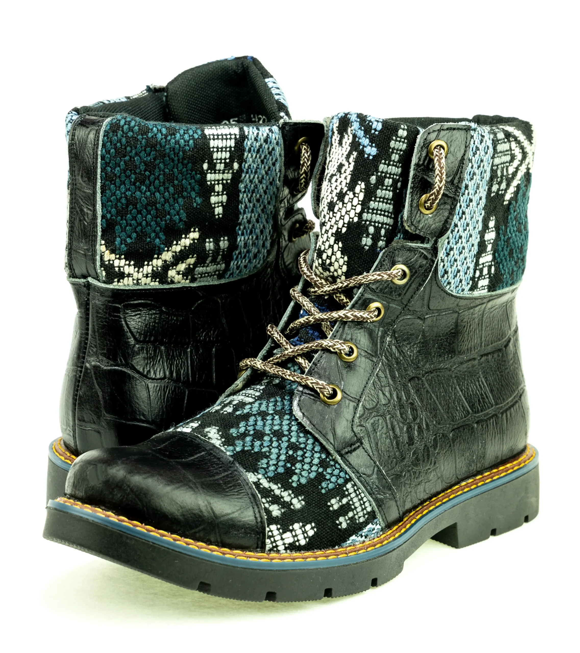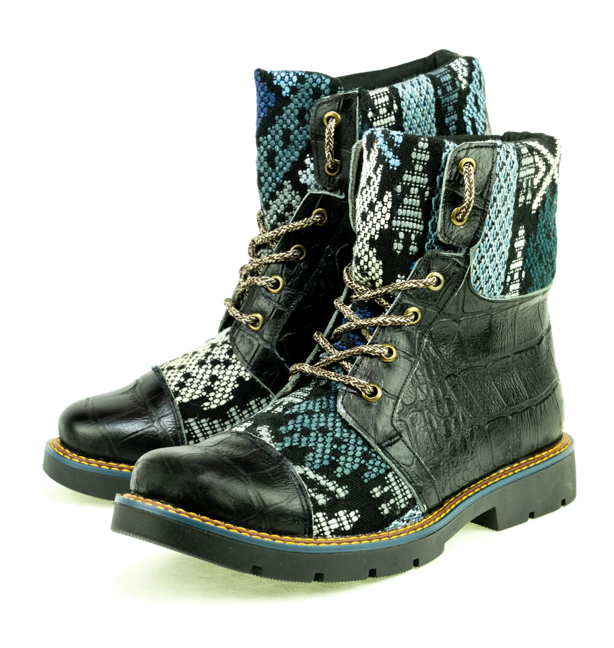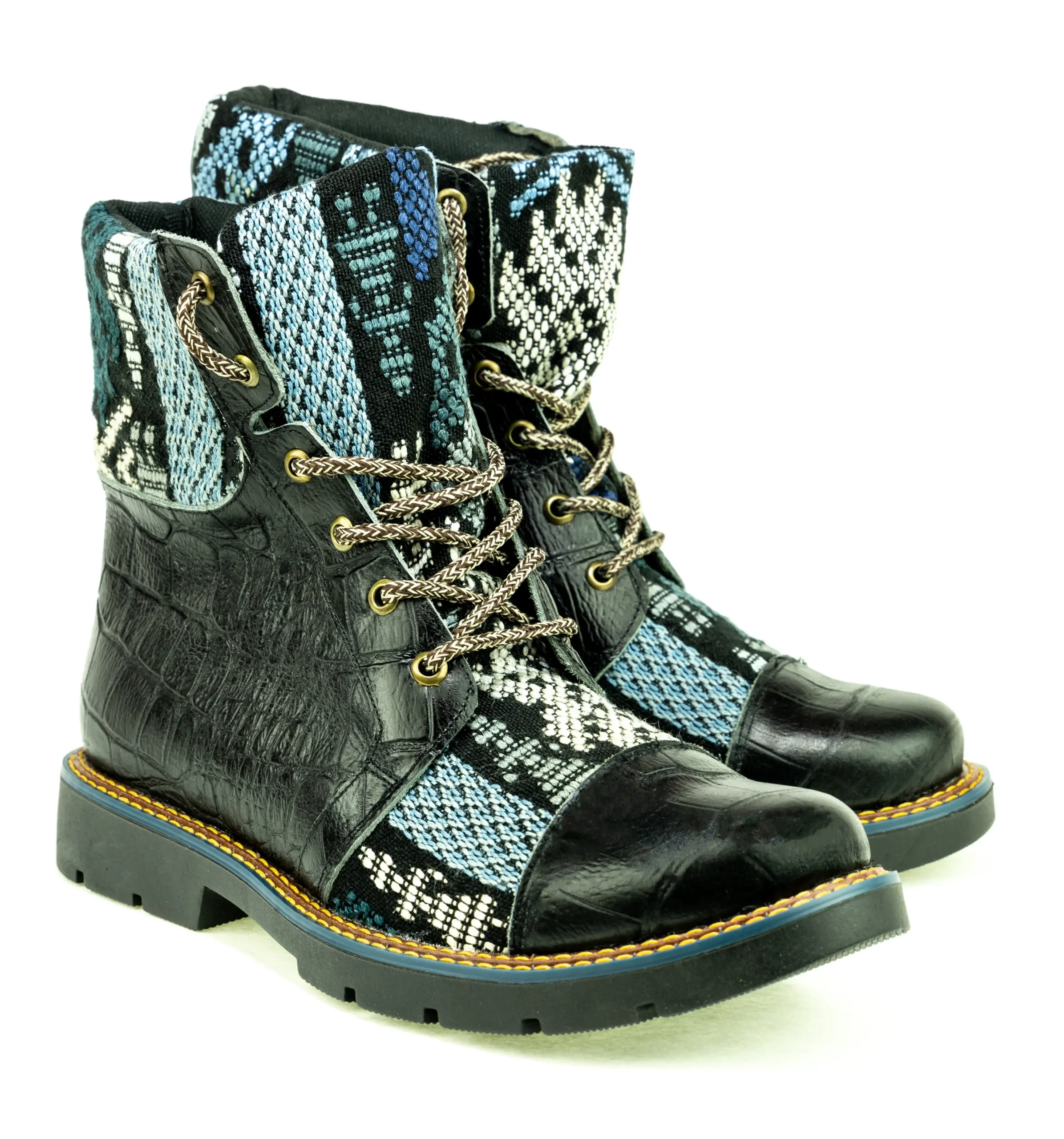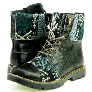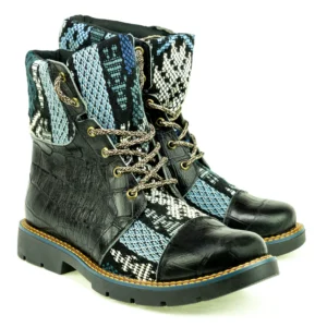 Pieza única e irrepetible. Bota minera de piel fusionada con auténtico textil maya tejido a mano en telar de cintura. Un diseño contemporáneo pensado para quienes valoran la moda consciente y buscan un estilo inigualable. Al ser una obra artesanal, no existe otro par igual en el mundo. Si es tu talla, es tu destino.