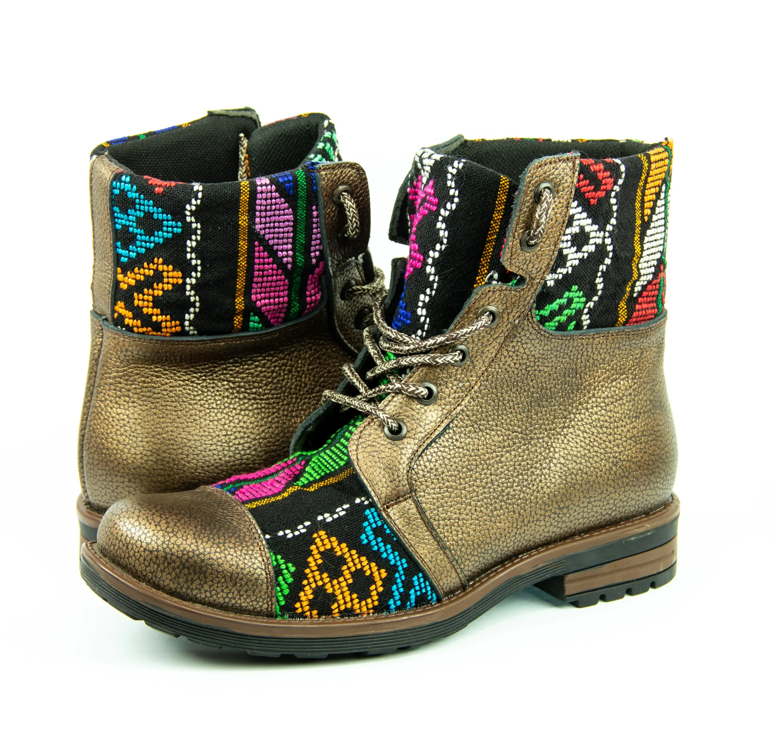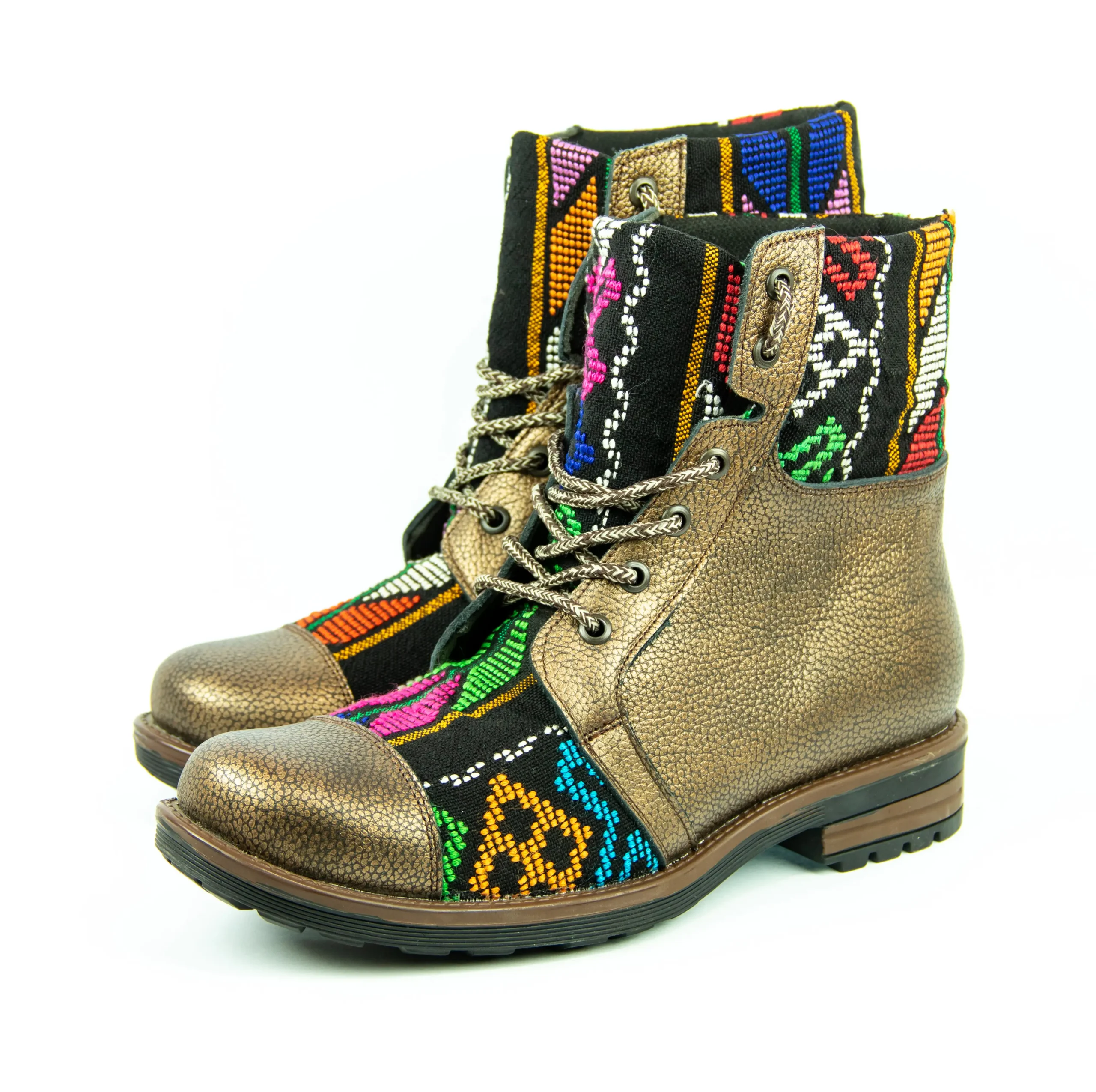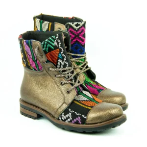 Pieza única e irrepetible. Bota minera de piel fusionada con auténtico textil maya tejido a mano en telar de cintura. Un diseño contemporáneo pensado para quienes valoran la moda consciente y buscan un estilo inigualable. Al ser una obra artesanal, no existe otro par igual en el mundo. Si es tu talla, es tu destino.