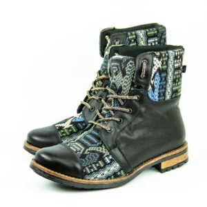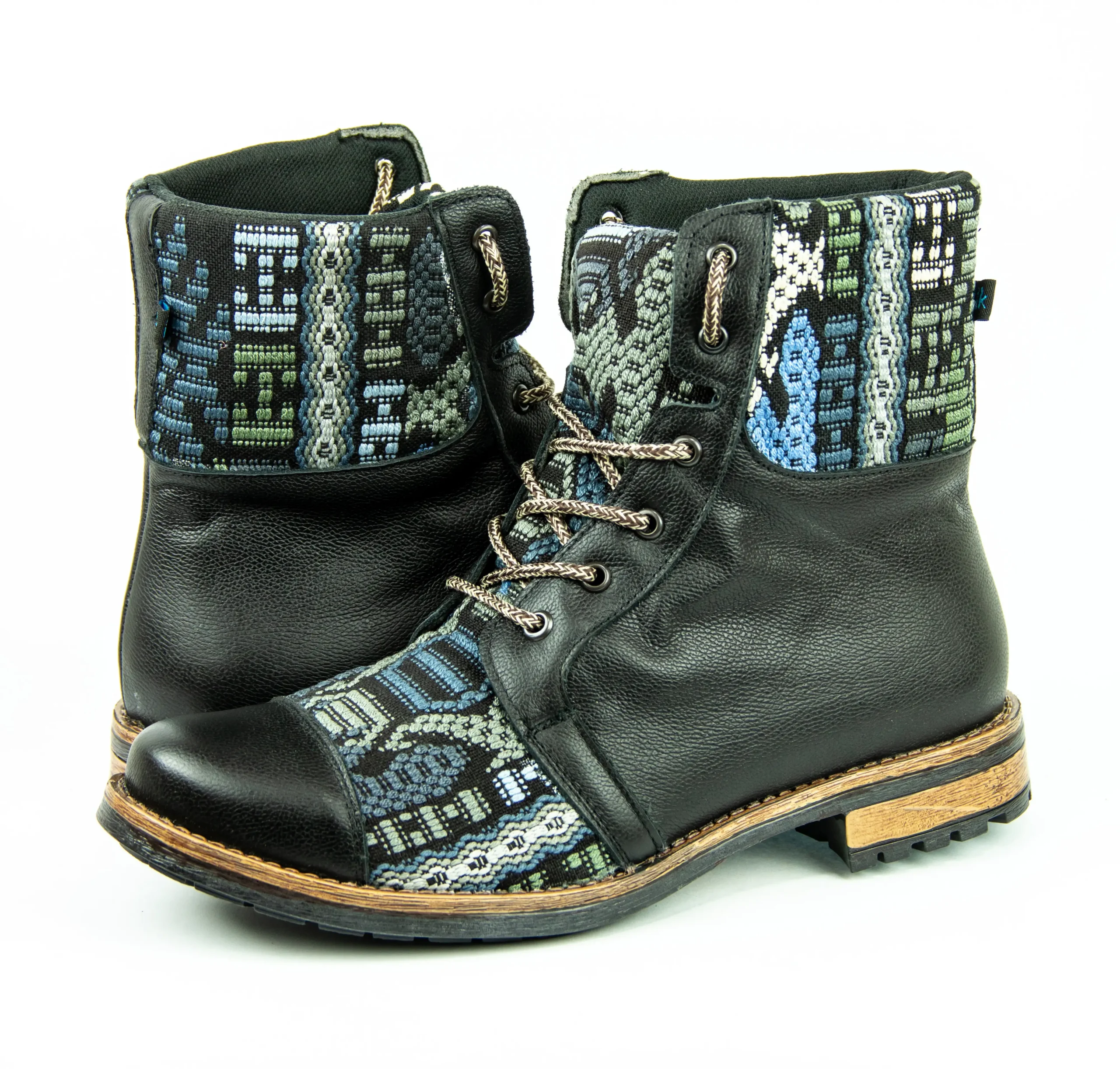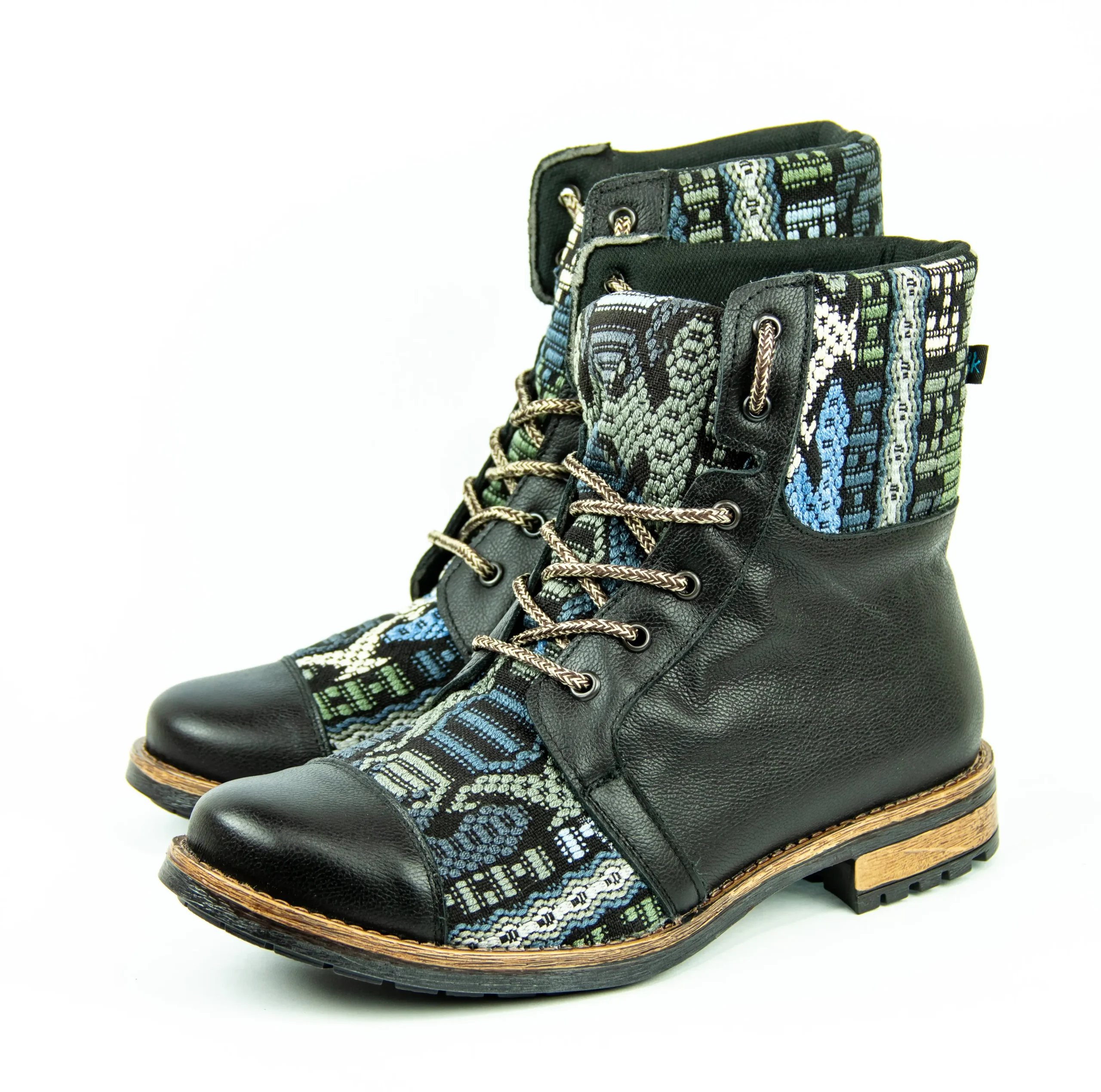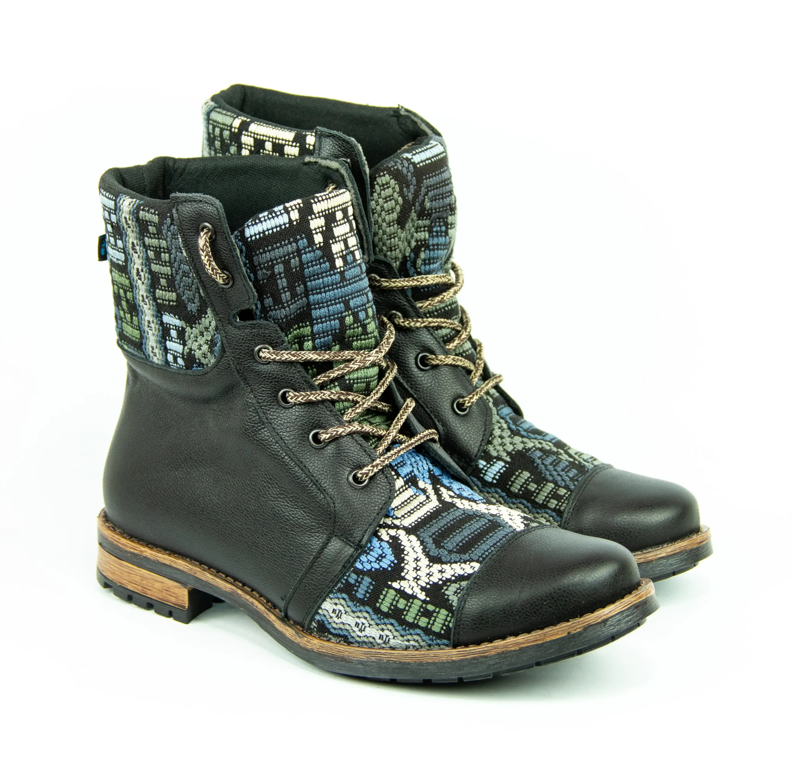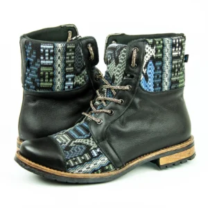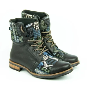 Pieza única e irrepetible. Bota minera de piel fusionada con auténtico textil maya tejido a mano en telar de cintura. Un diseño contemporáneo pensado para quienes valoran la moda consciente y buscan un estilo inigualable. Al ser una obra artesanal, no existe otro par igual en el mundo. Si es tu talla, es tu destino.