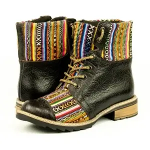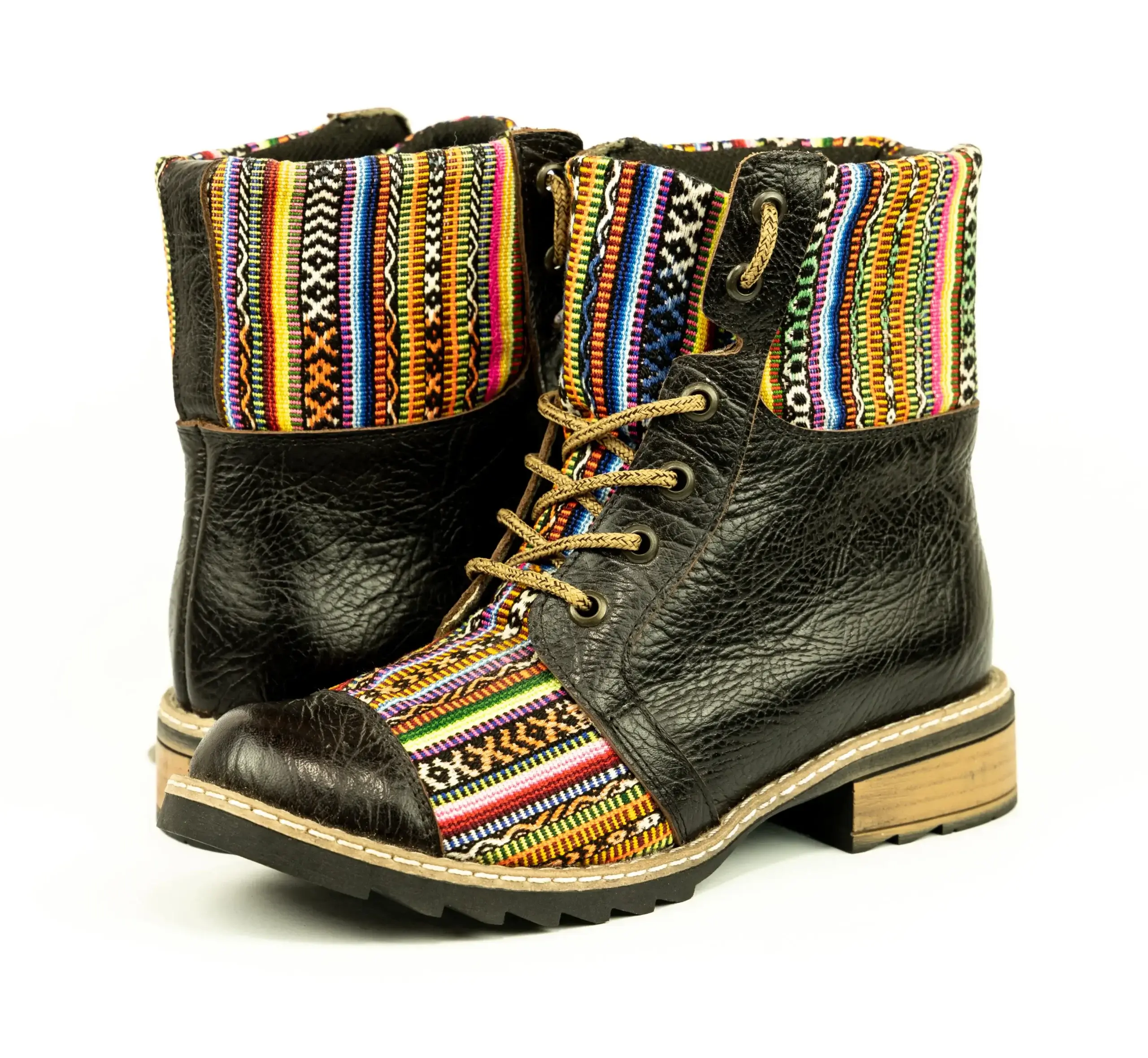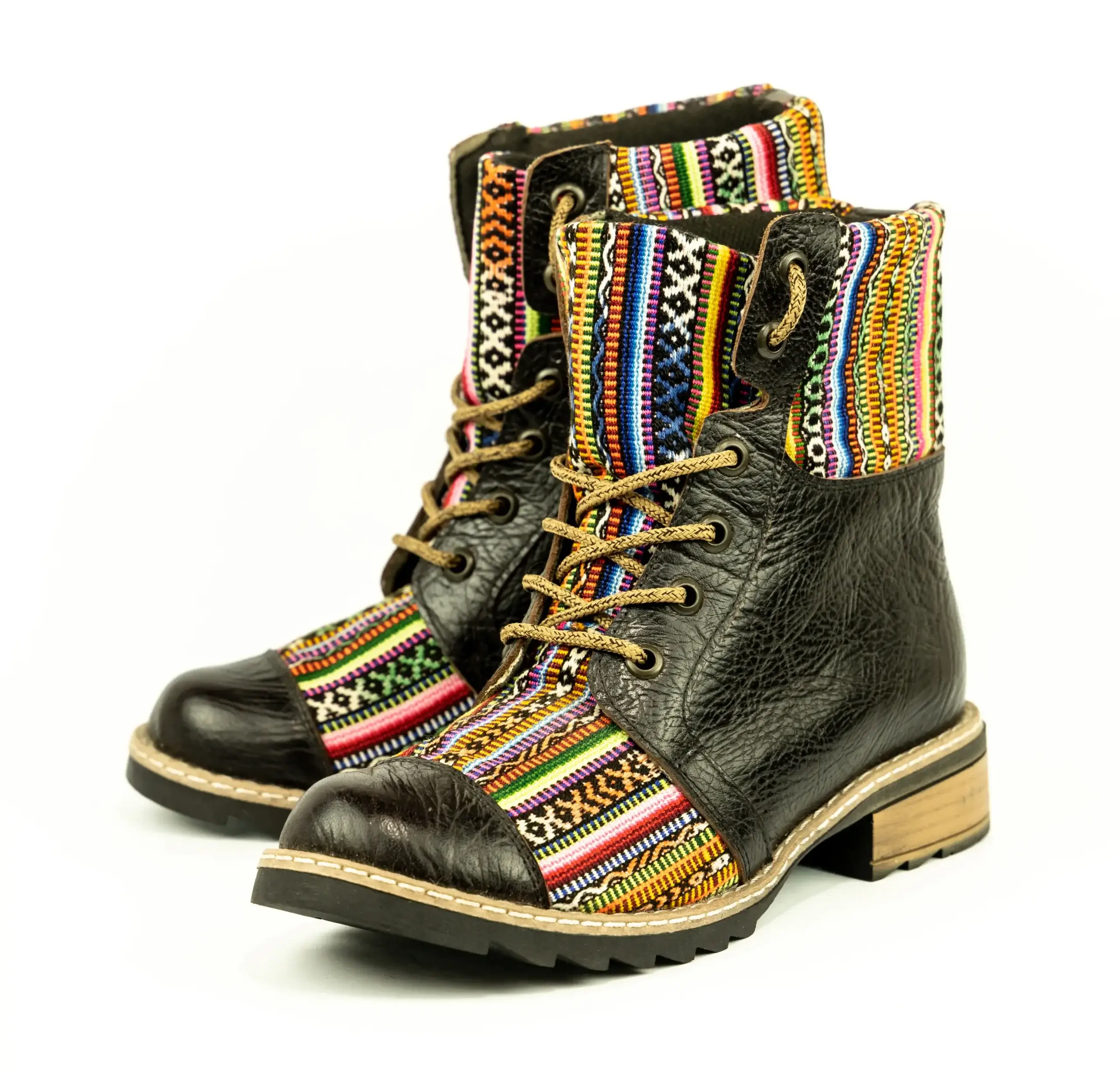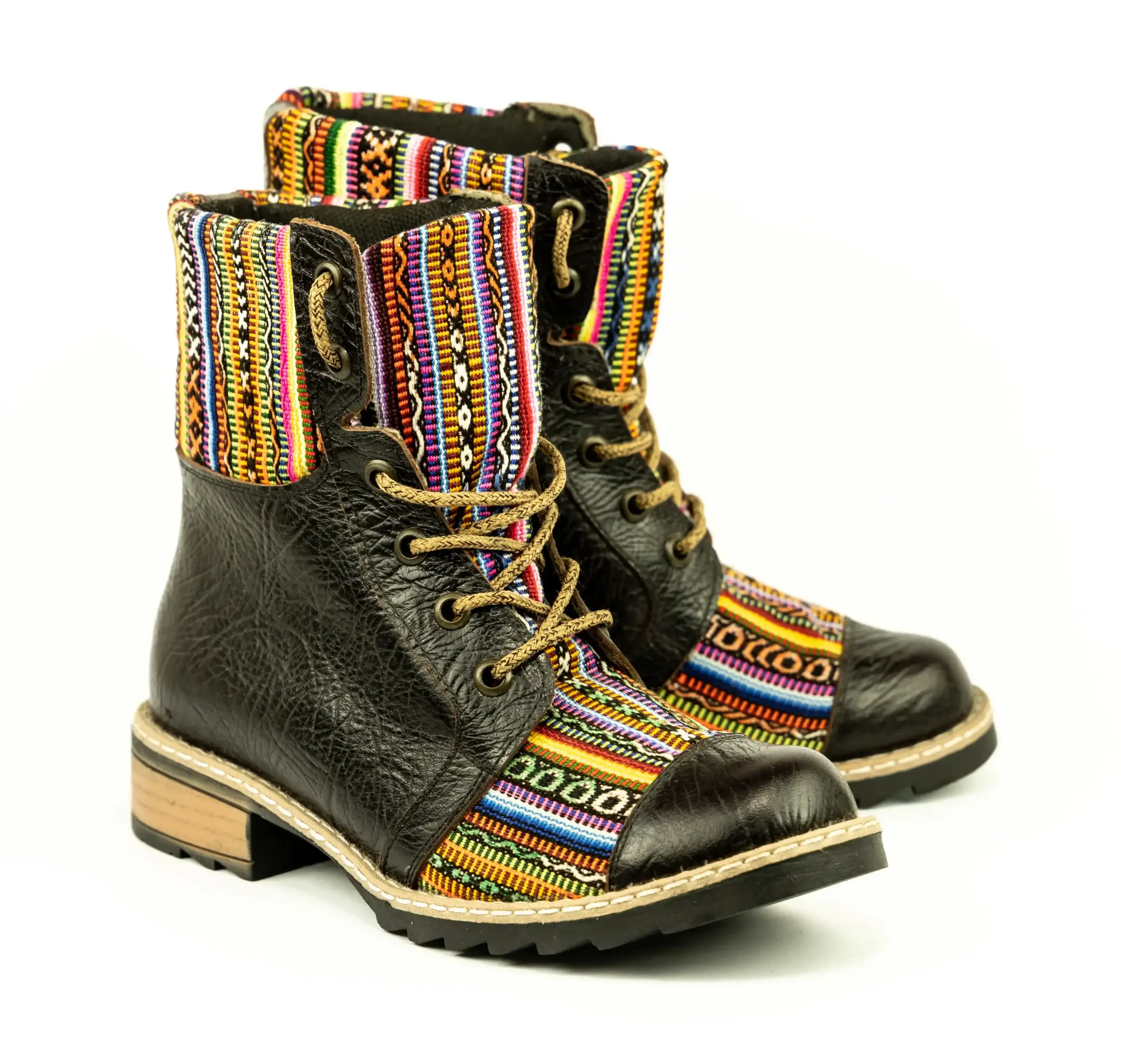 Pieza única e irrepetible. Bota minera de piel fusionada con auténtico textil maya tejido a mano en telar de cintura. Un diseño contemporáneo pensado para quienes valoran la moda consciente y buscan un estilo inigualable. Al ser una obra artesanal, no existe otro par igual en el mundo. Si es tu talla, es tu destino.