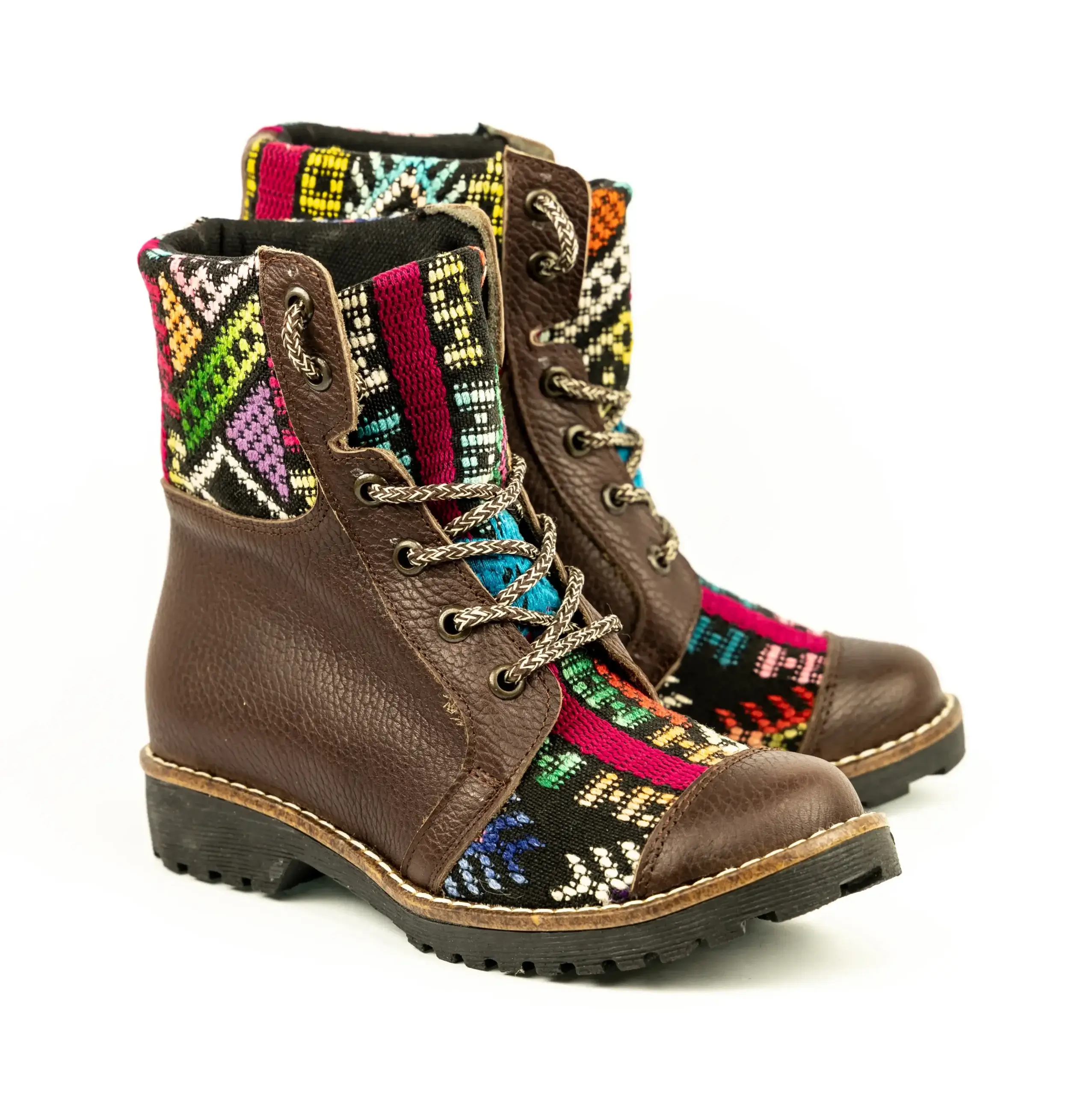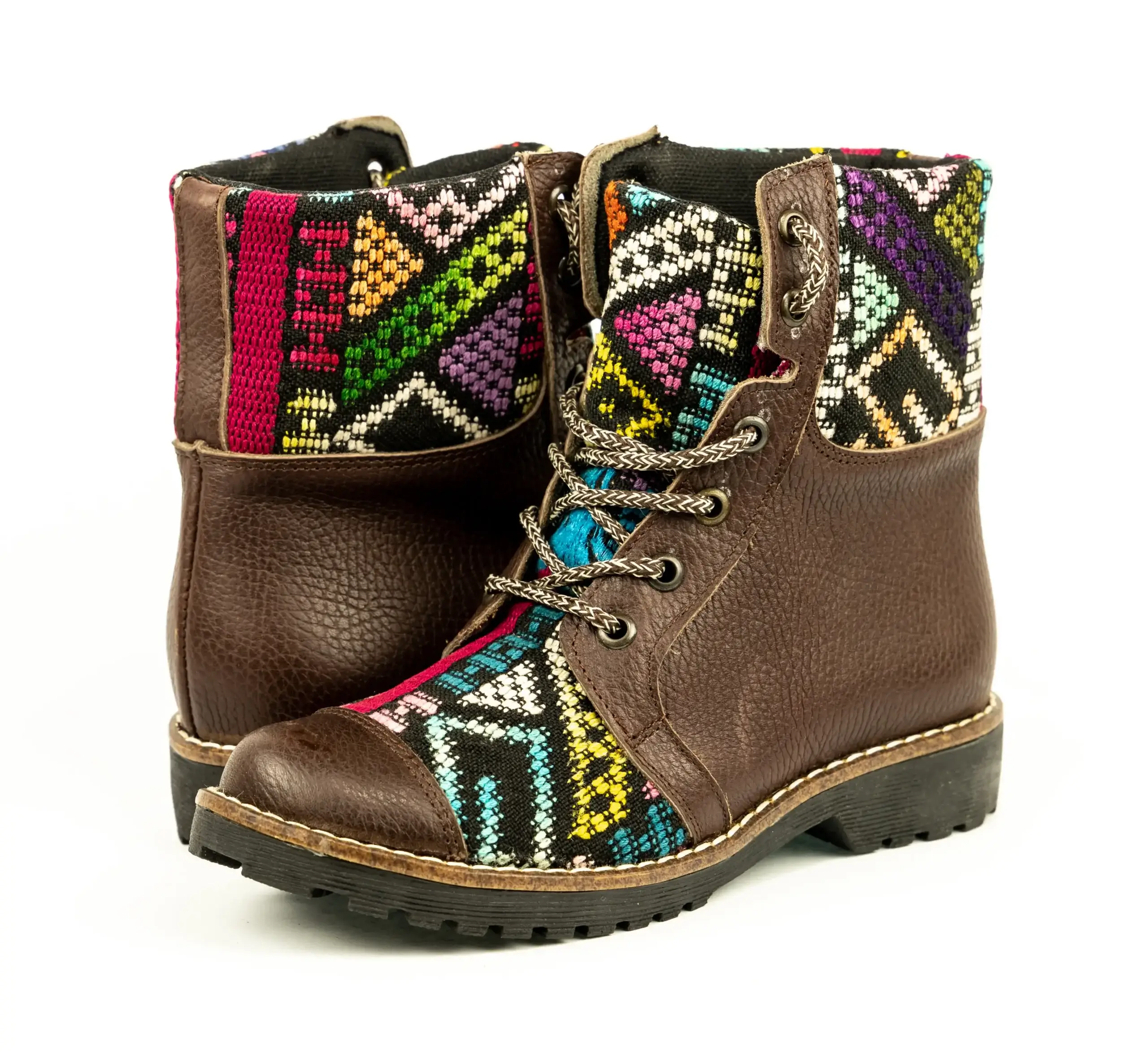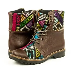 Pieza única e irrepetible. Bota minera de piel fusionada con auténtico textil maya tejido a mano en telar de cintura. Un diseño contemporáneo pensado para quienes valoran la moda consciente y buscan un estilo inigualable. Al ser una obra artesanal, no existe otro par igual en el mundo. Si es tu talla, es tu destino.