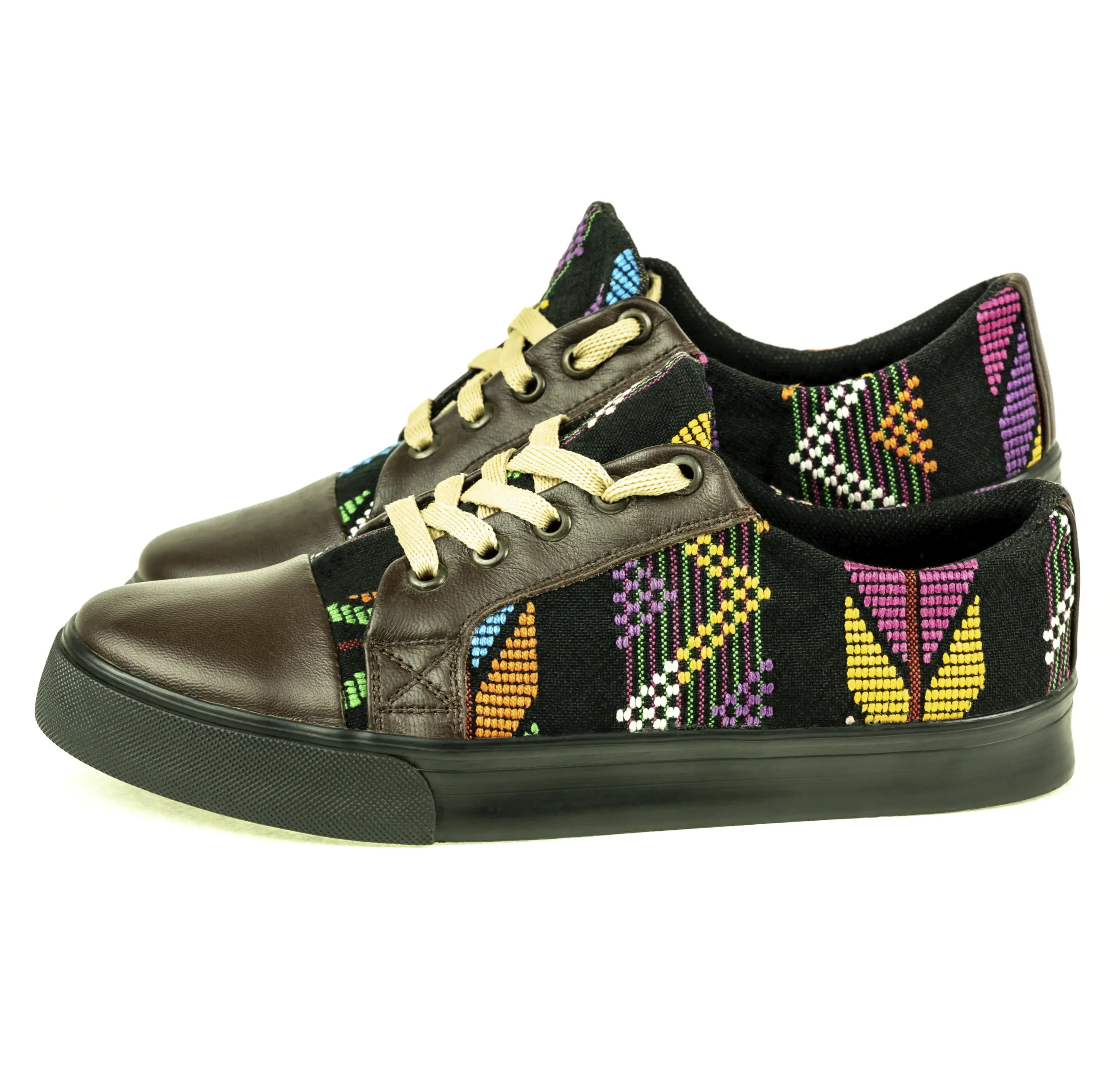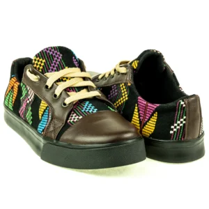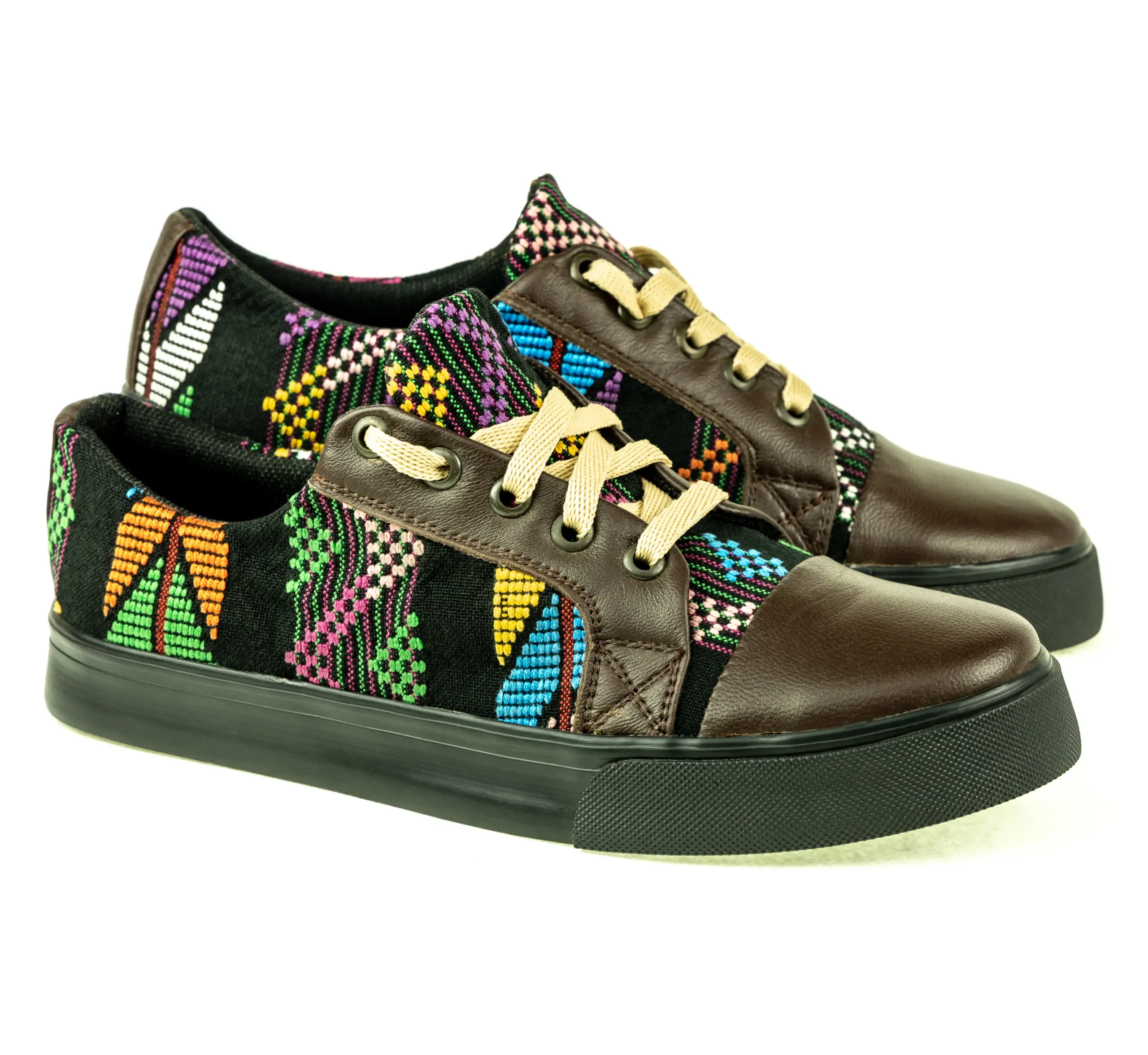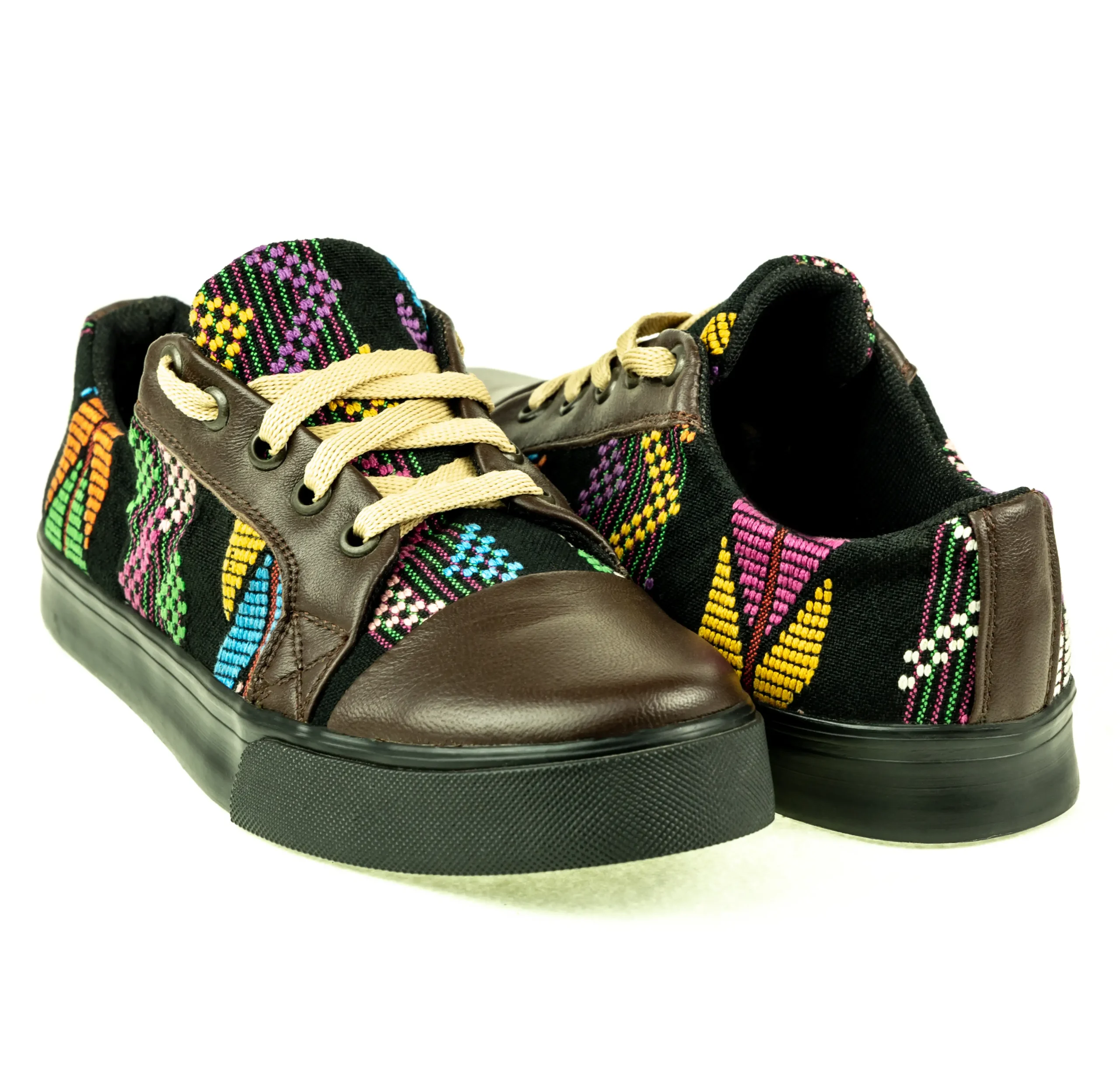 Pieza única e irrepetible. Tenis de piel fusionados con auténtico textil maya tejido a mano en telar de cintura. Un diseño urbano y contemporáneo pensado para quienes valoran la moda consciente y buscan comodidad con un estilo inigualable. Al ser una obra artesanal, no existe otro par igual en el mundo. Si es tu talla, es tu destino.